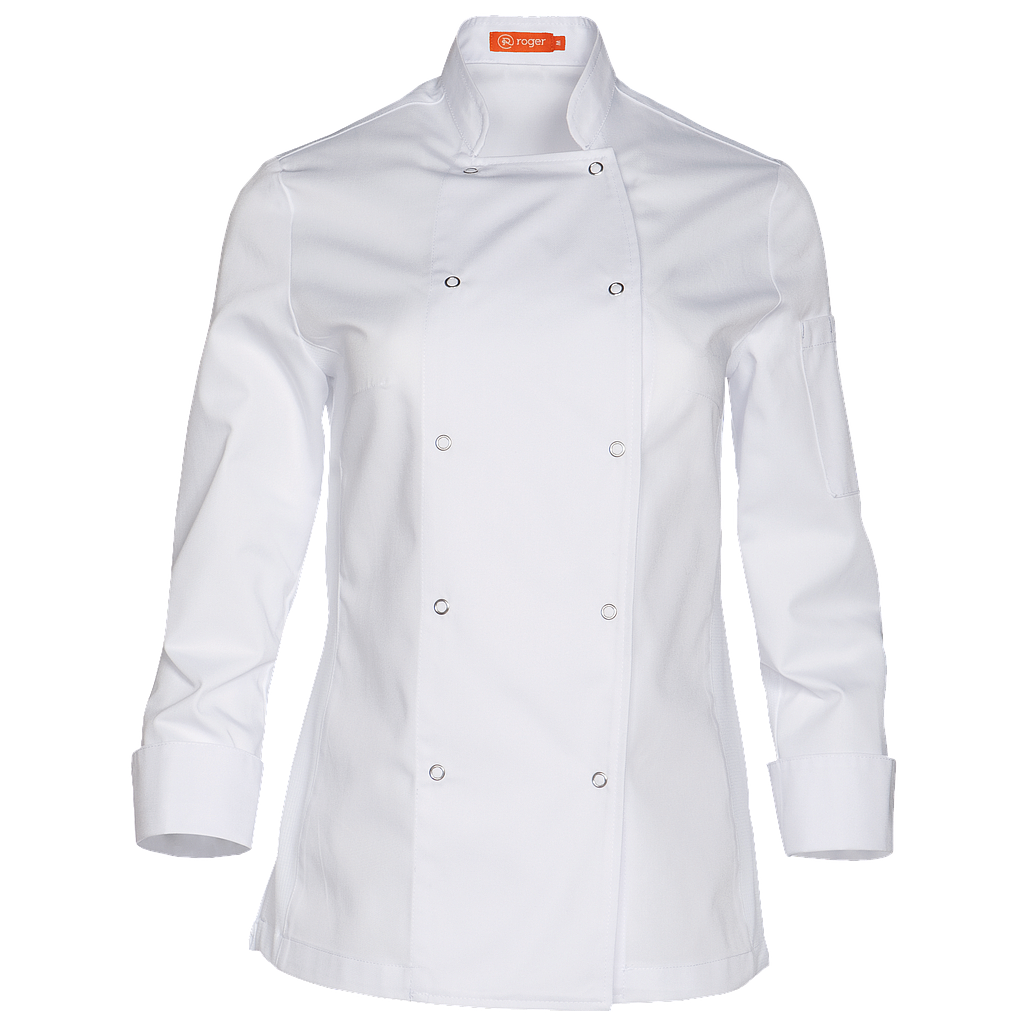 Chaqueta de cocina manga larga para mujer, con cierre cruzado y doble fila de botonadura de click para un estilo refinado. Bolsillo de vivo en manga izquierda para mayor utilidad. Costadillo y bajo manga en 100% Poliéster Coolmax Transpirable para una comodidad óptima. Perfecta para chefs que buscan elegancia y funcionalidad en su vestimenta laboral.